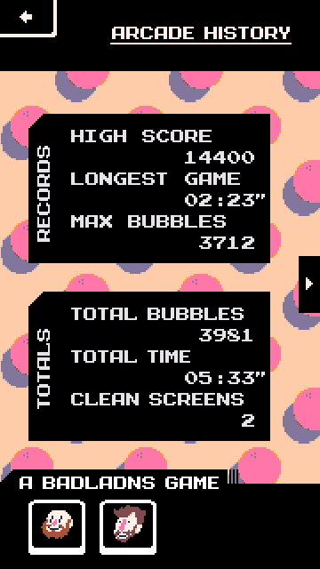 There are several characters to unlock, and the game tracks your best score, time and bubble count.